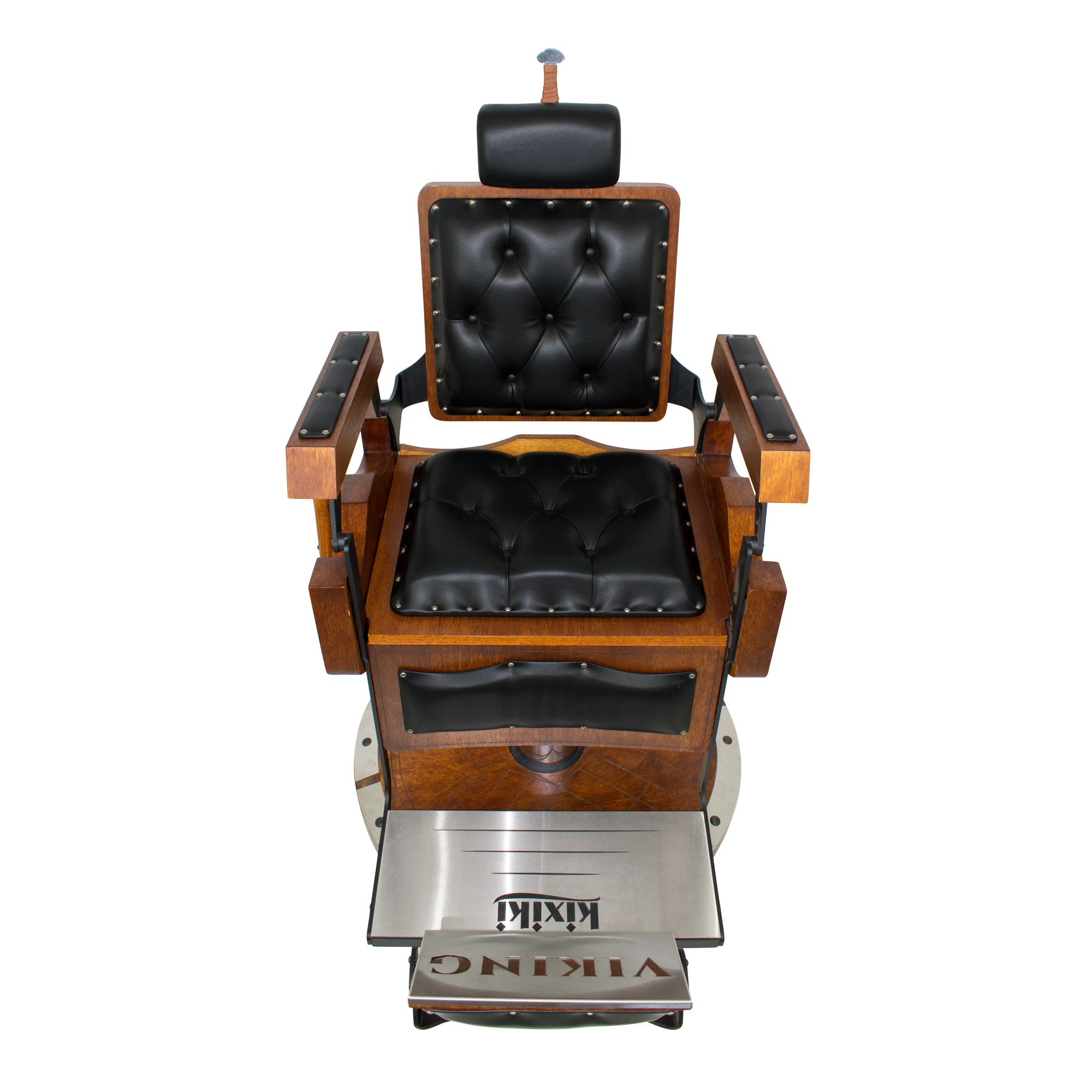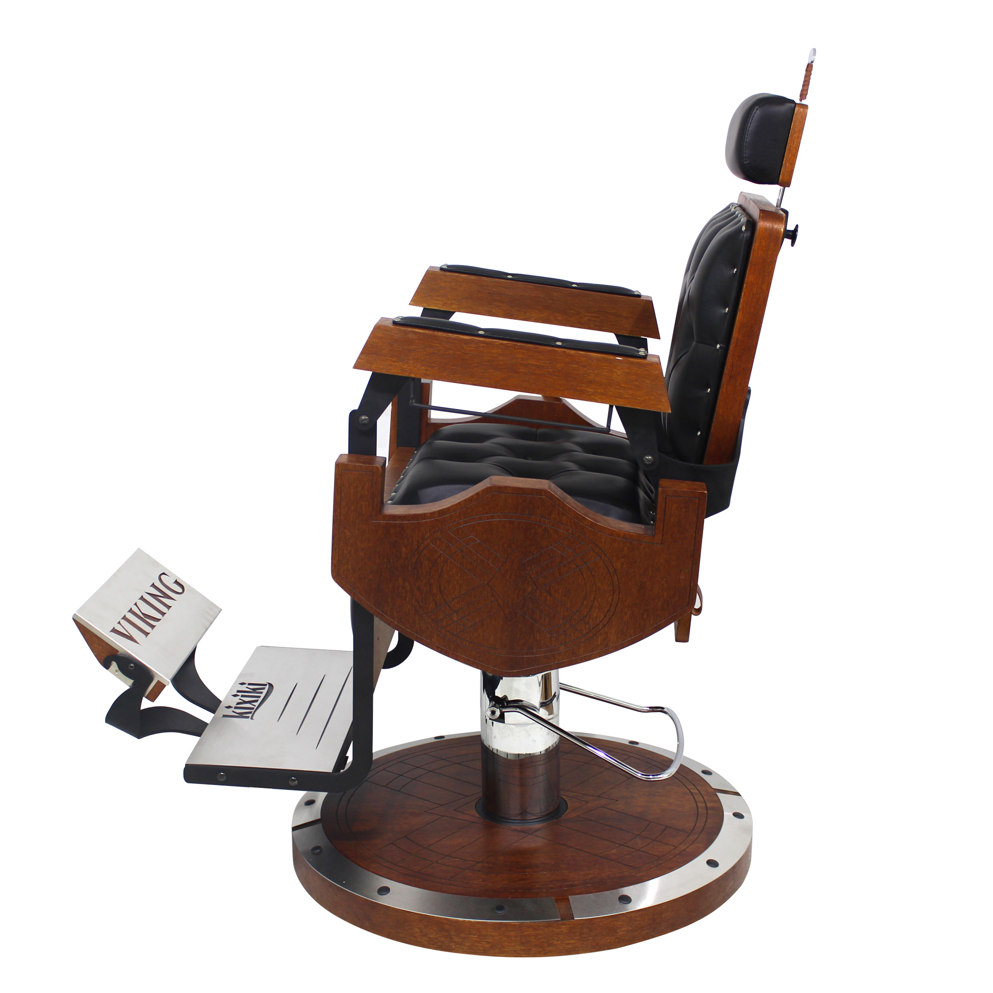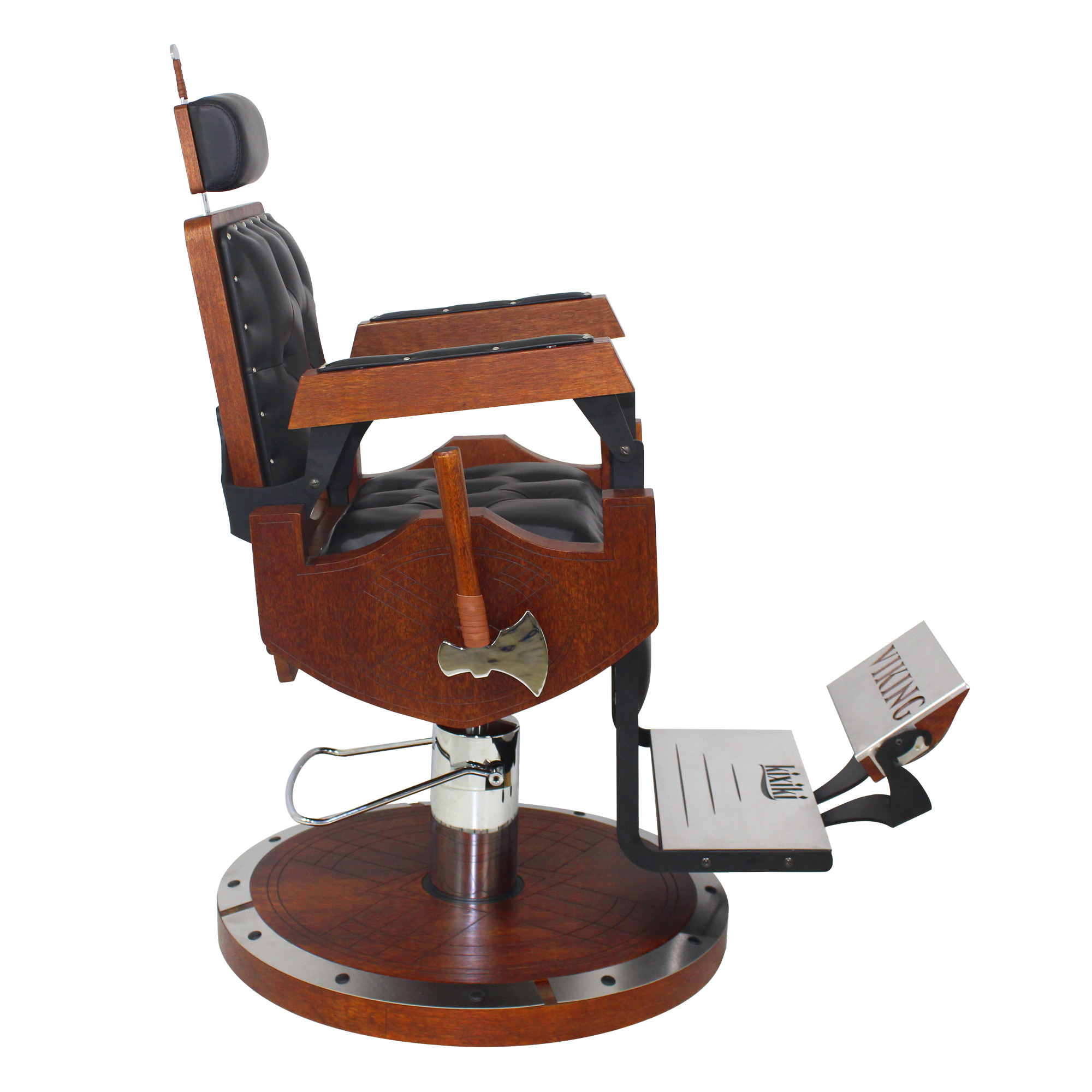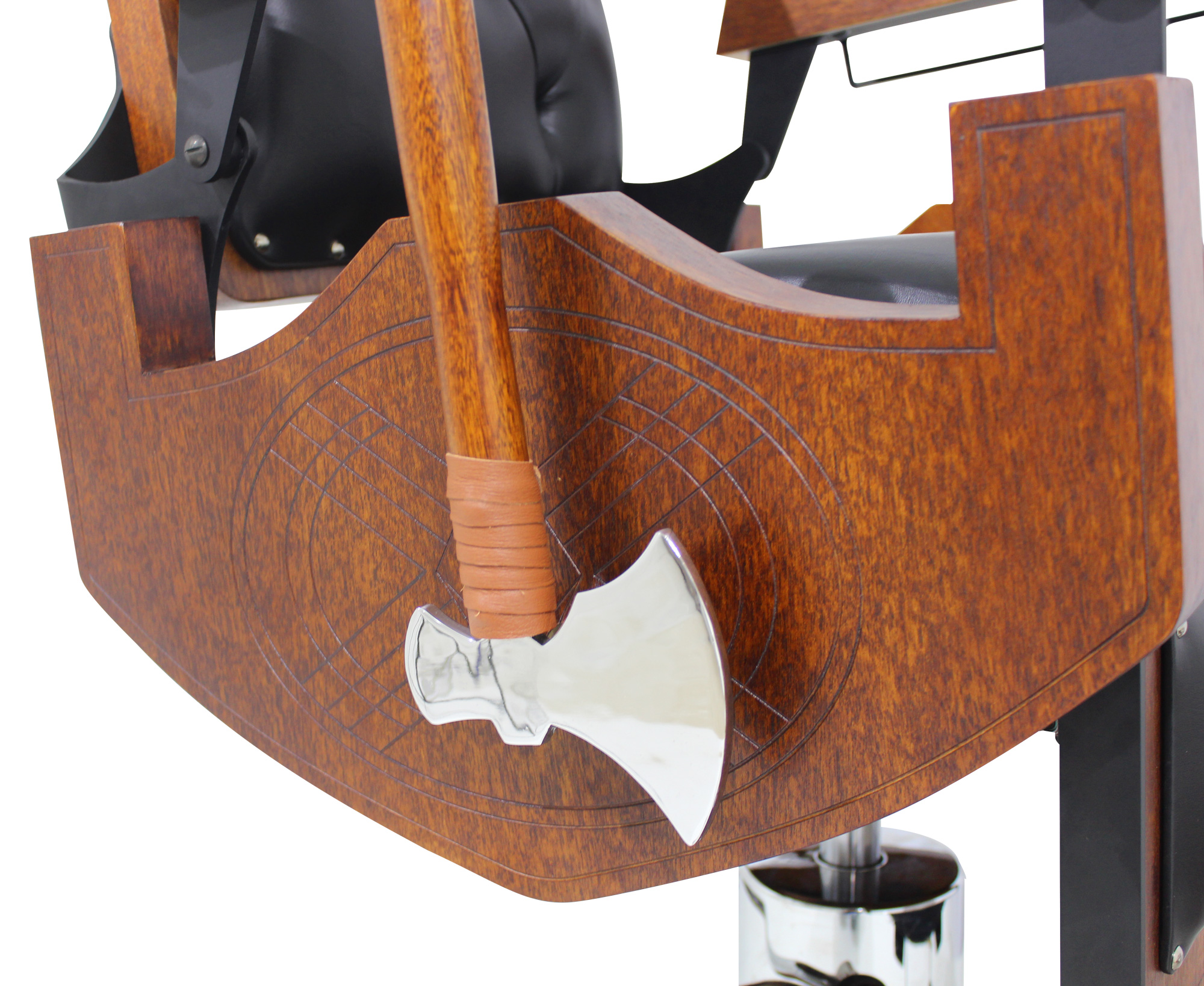Cadeira de barbeiro reclinável e hidráulica com design inspirado nos barcos, escudos e armas vikings. Praticidade, durabilidade, conforto absoluto e acabamento bárbaro.