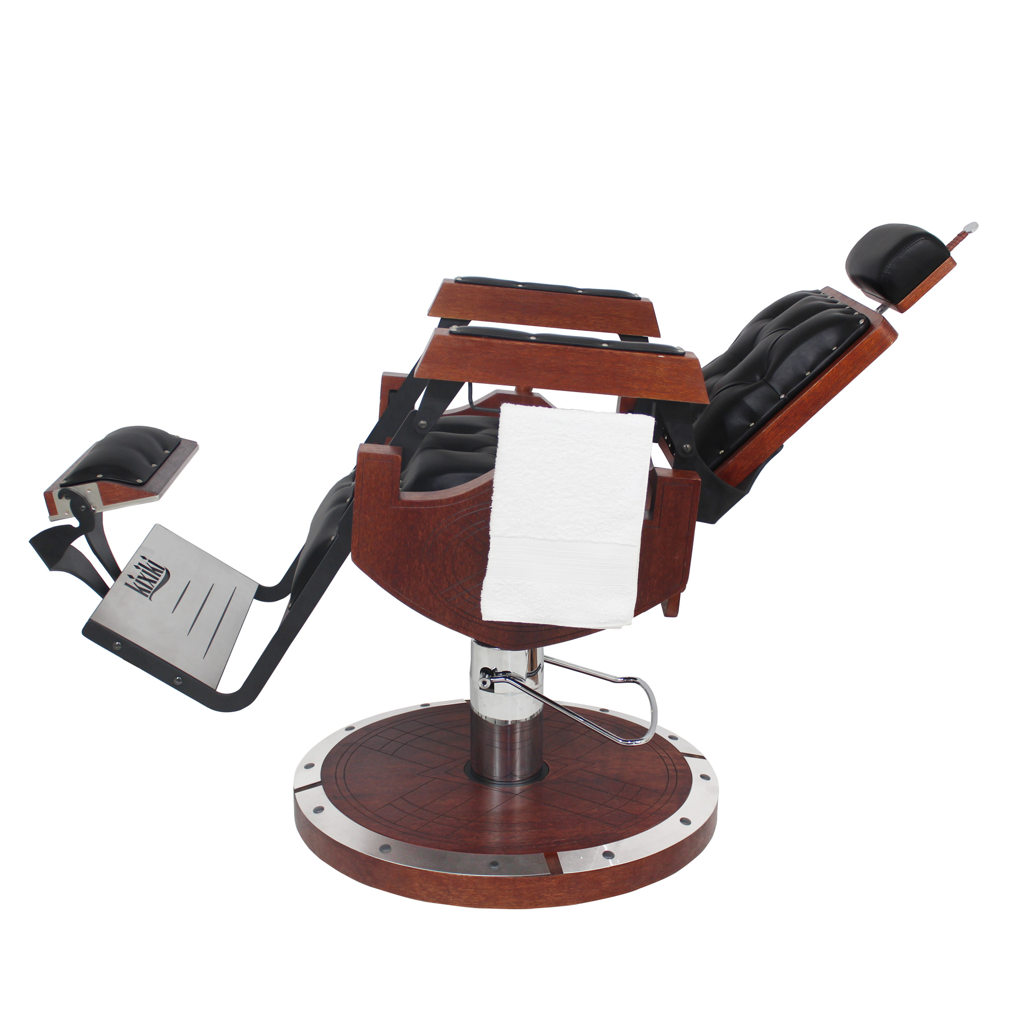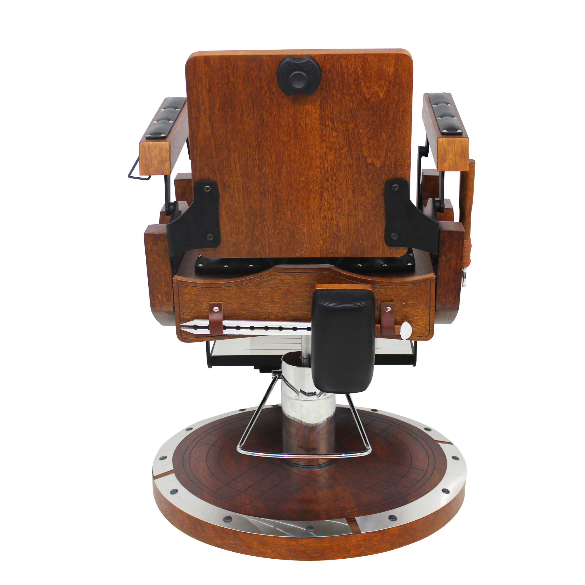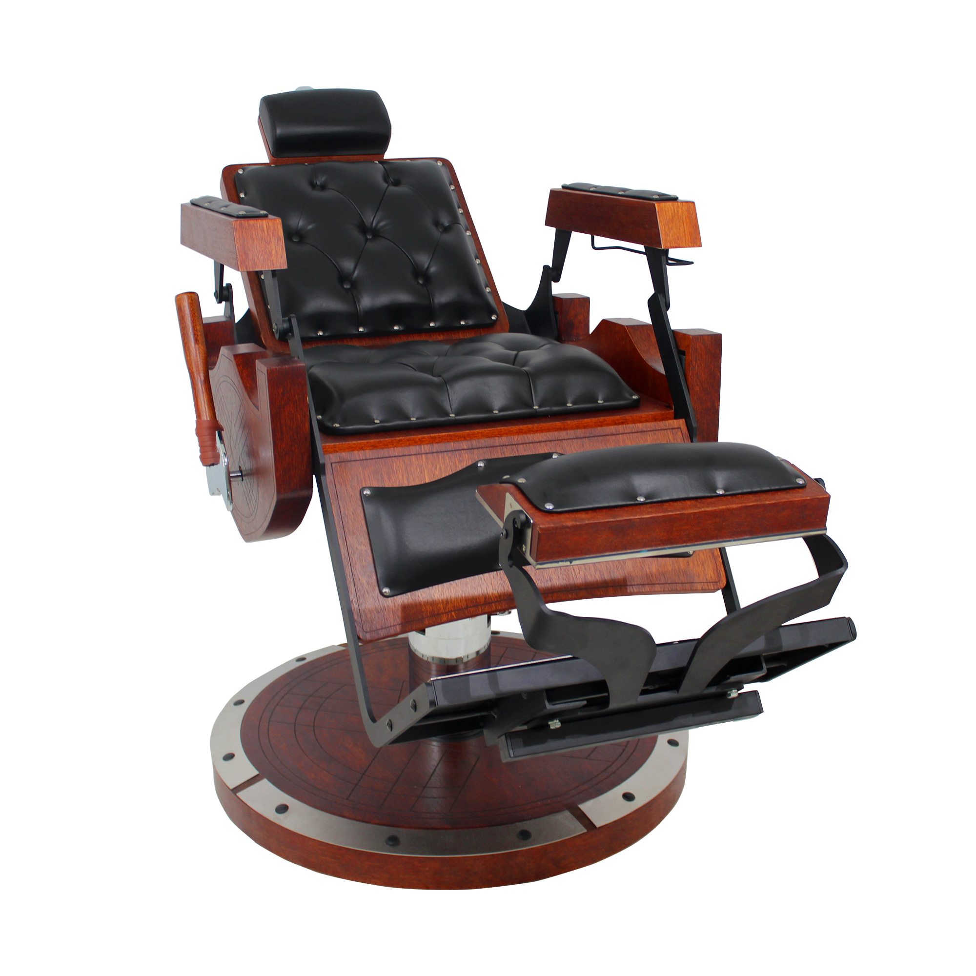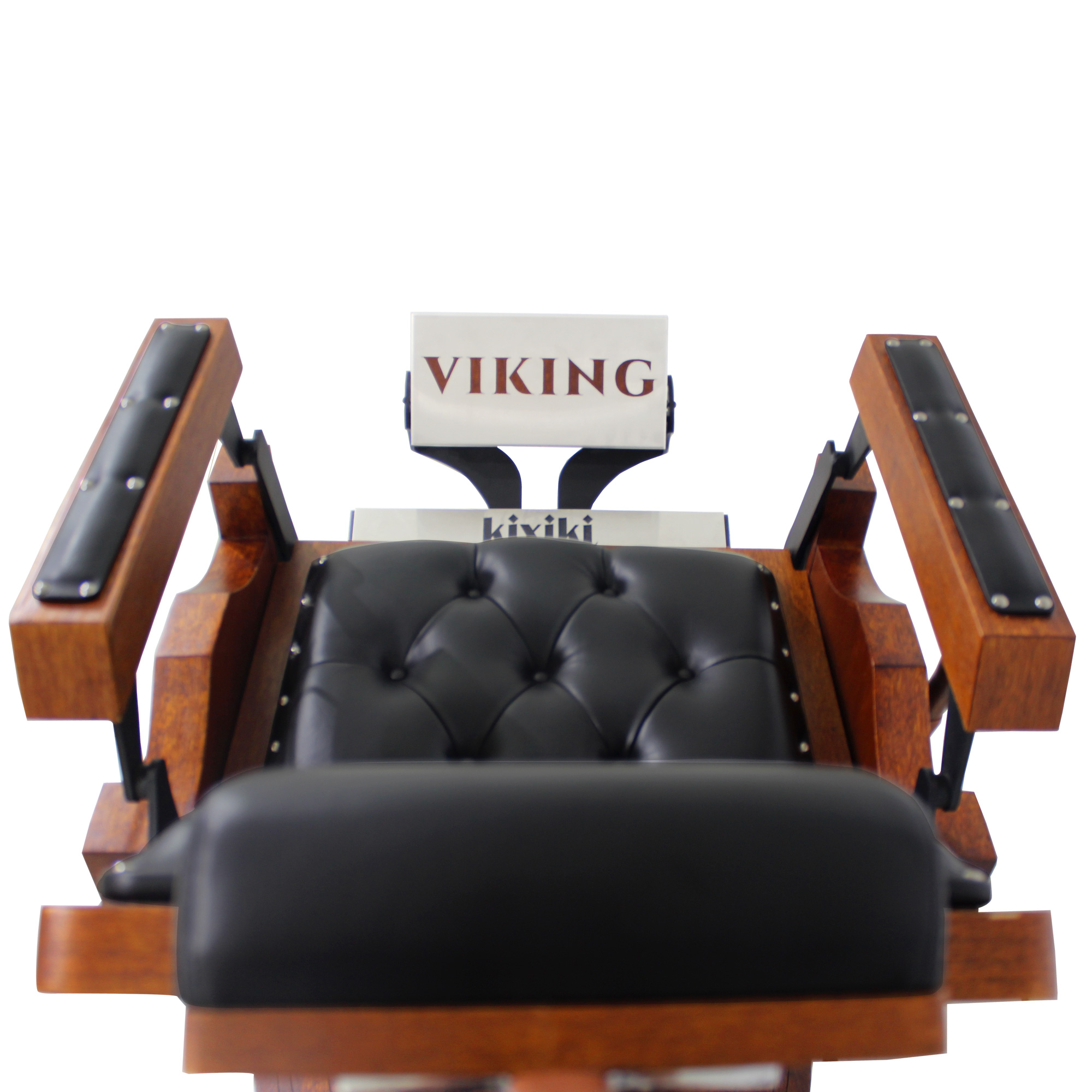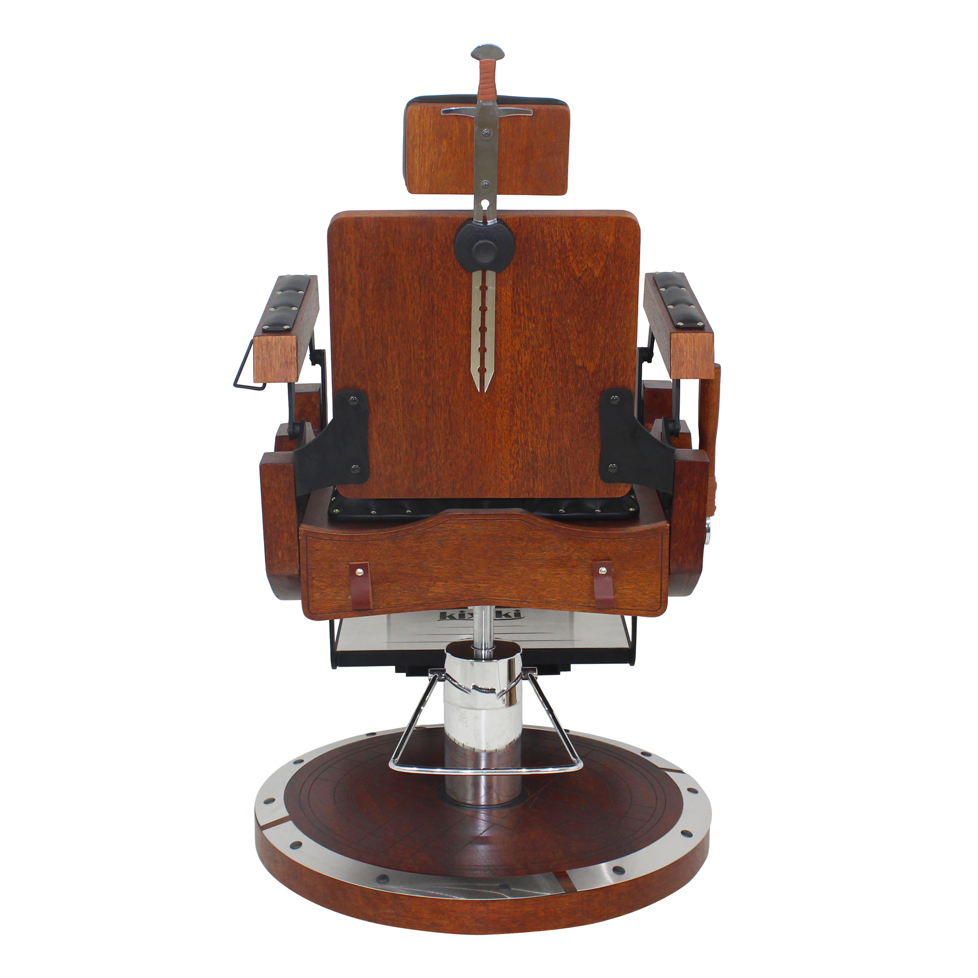 Cadeira de barbeiro reclinável e hidráulica com design inspirado nos barcos, escudos e armas vikings. Praticidade, durabilidade, conforto absoluto e acabamento bárbaro.