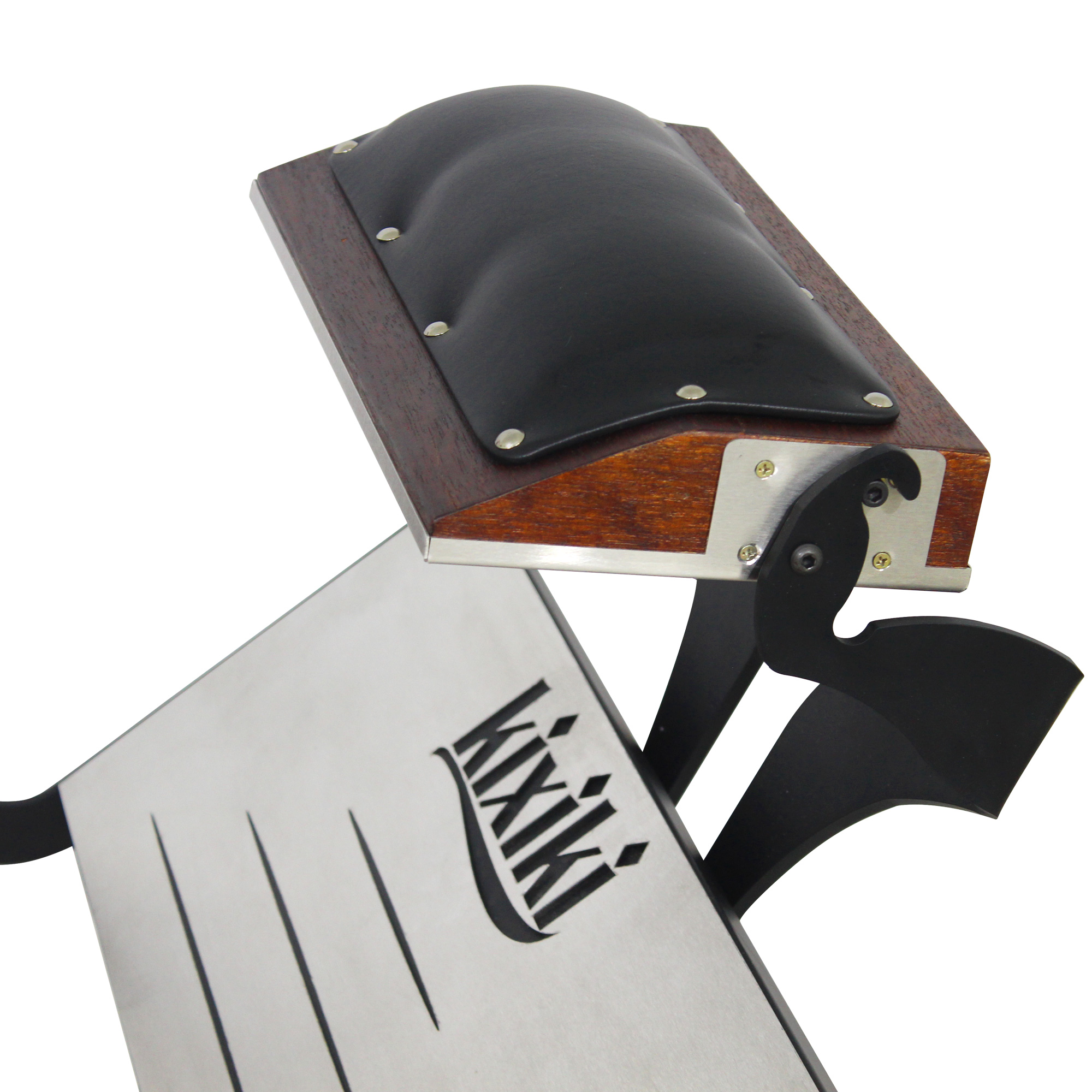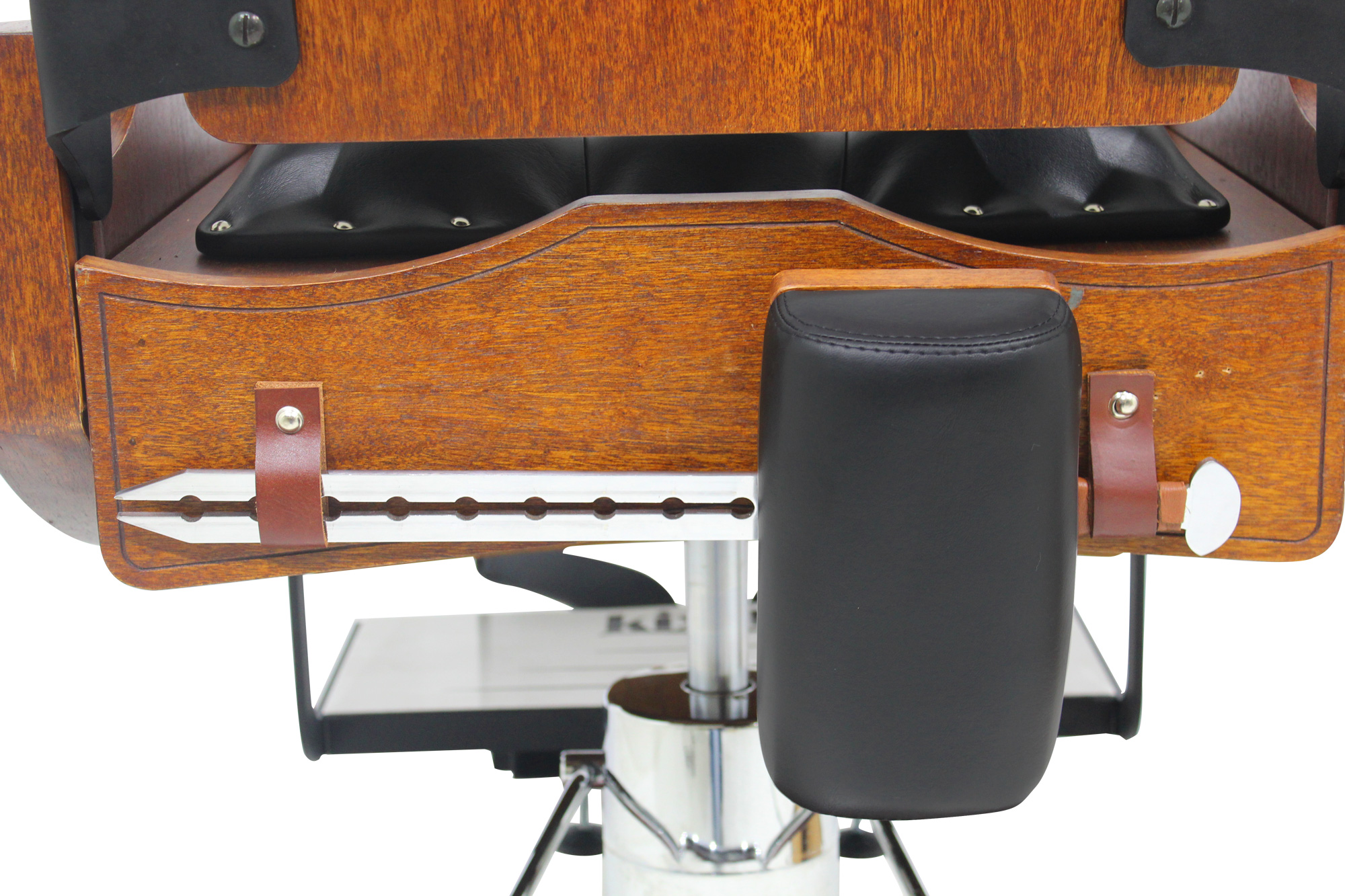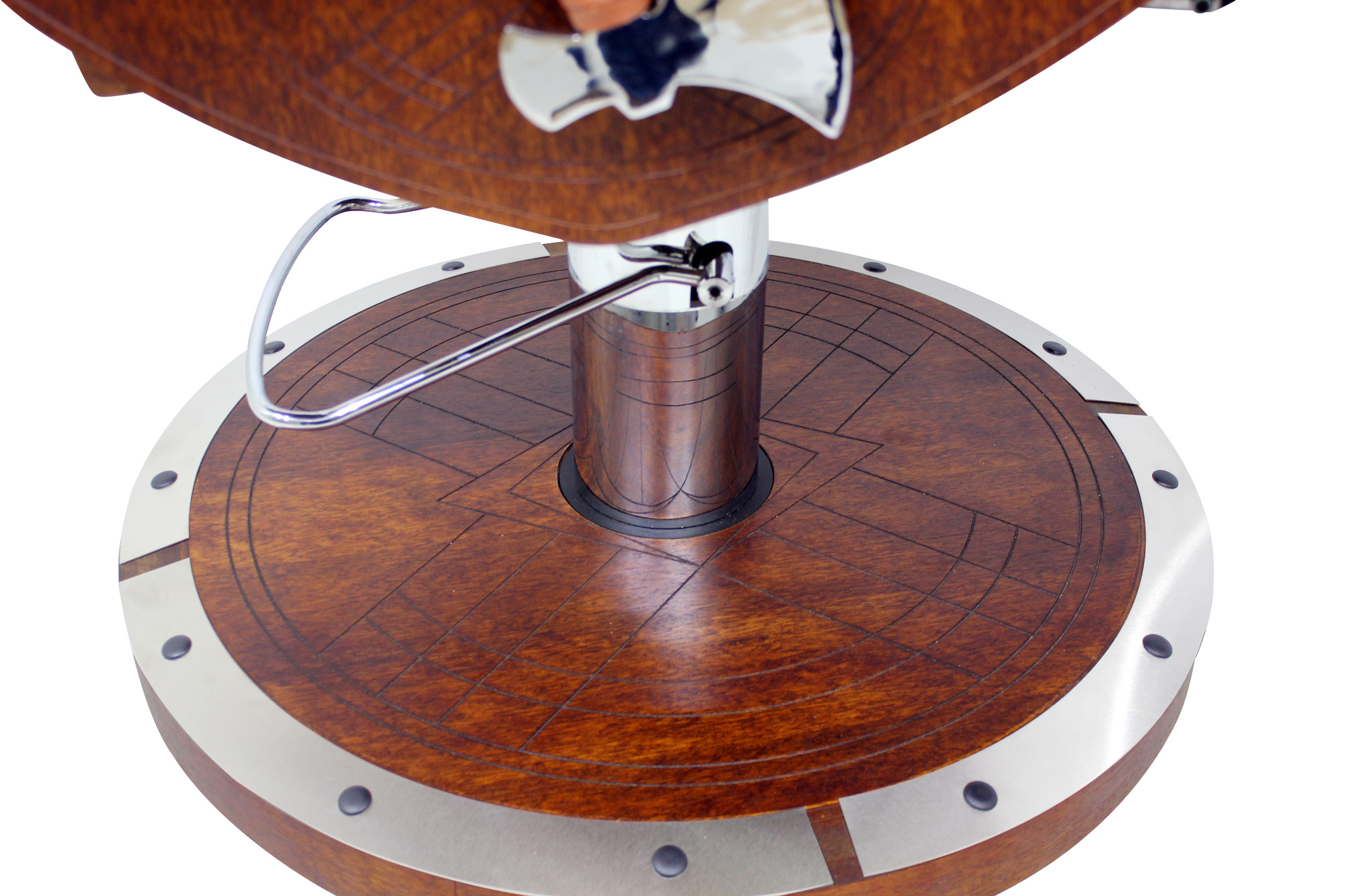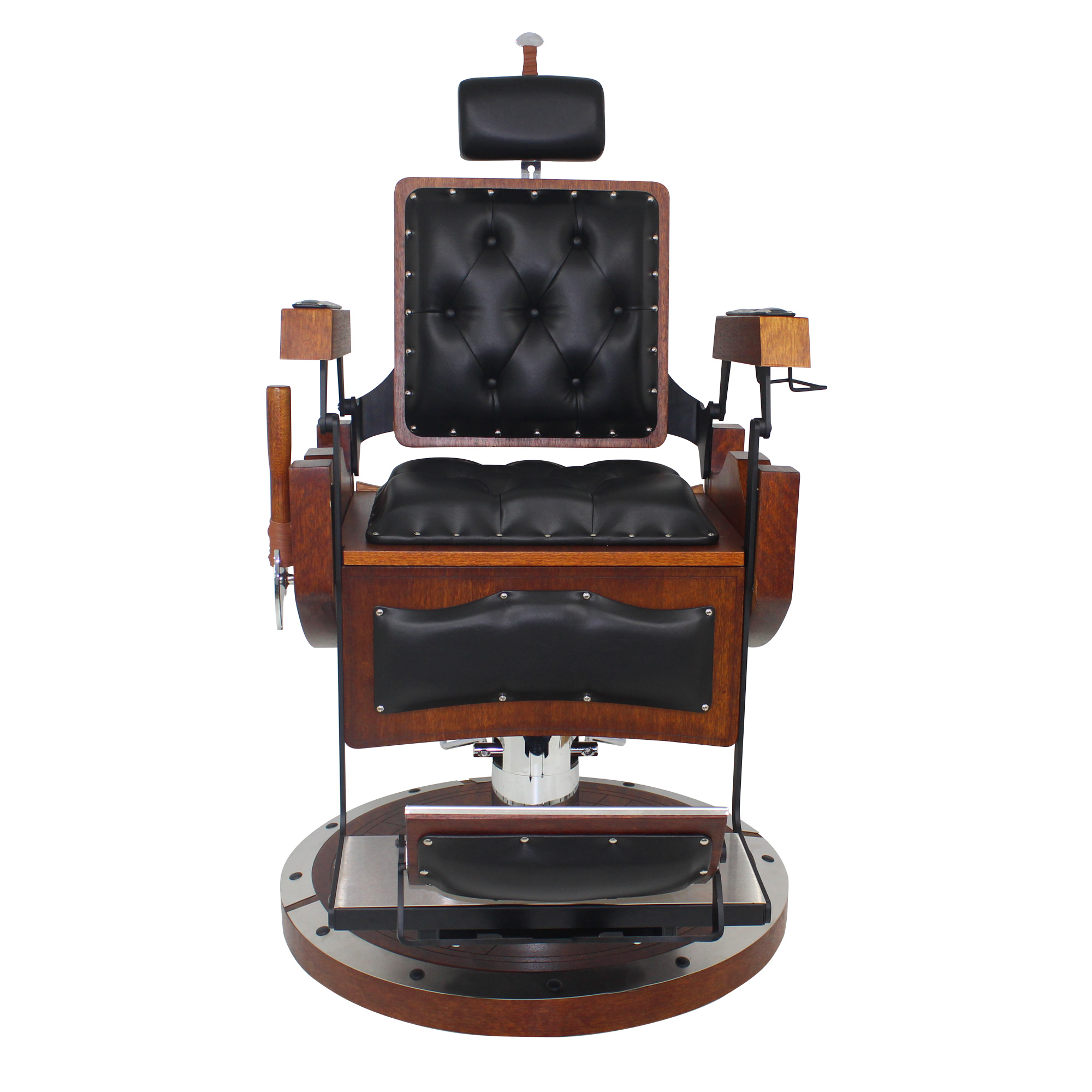 Cadeira de barbeiro reclinável e hidráulica com design inspirado nos barcos, escudos e armas vikings. Praticidade, durabilidade, conforto absoluto e acabamento bárbaro.