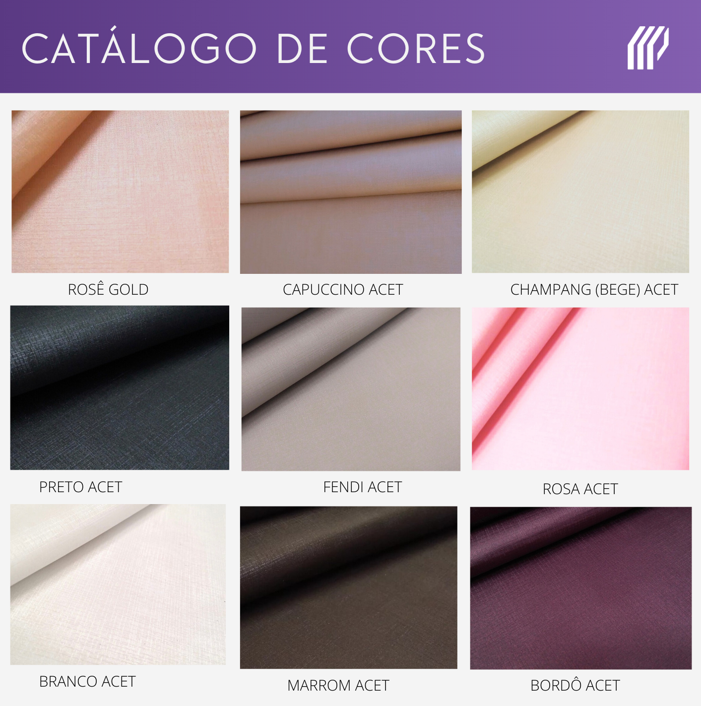 Bordô Acetinado, Branco Acetinado, Capuccino Acetinado, Champang Acetinado (Bege), Fendi Acetinado, Marrom Acetinado, Preto Acetinado, Rosa Bebê Acetinado, Rosê Gold